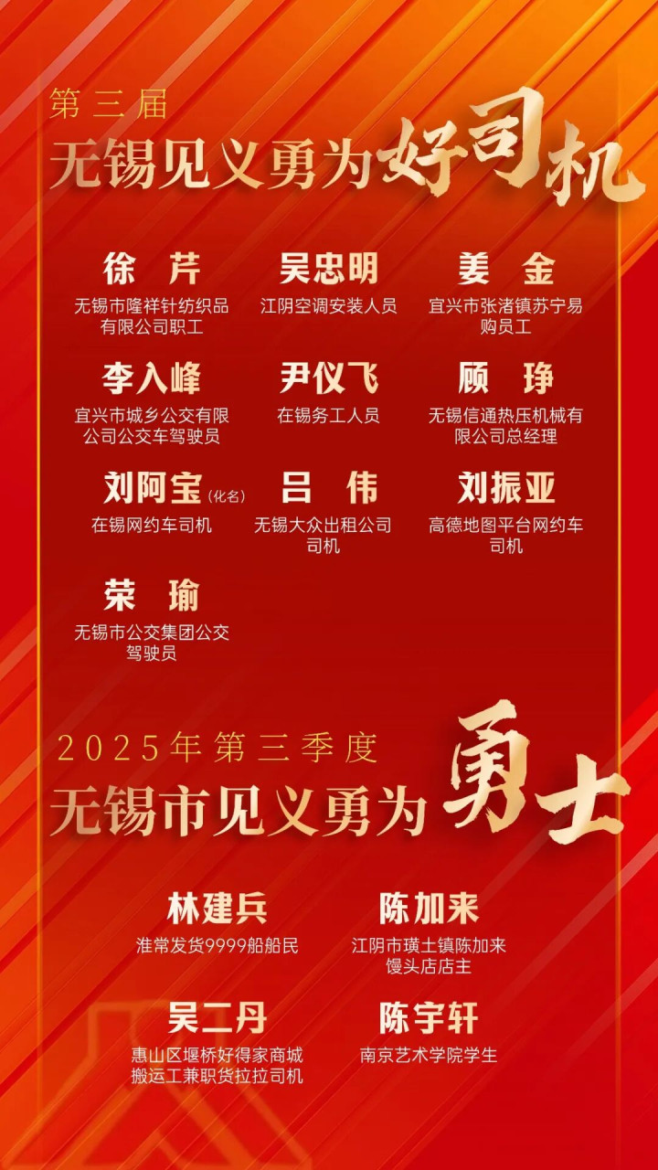 仪式现场揭晓“交通能源杯”第三届“无锡见义勇为好司机”名单,公布2025年第三季度“无锡市见义勇为勇士榜”。此外,“无锡市见义勇为基金会”“无锡市新时代见义勇为实践中心”“无锡市见义勇为志愿服务”徽标,无锡市见义勇为卡通IP形象也在会上一一公布。